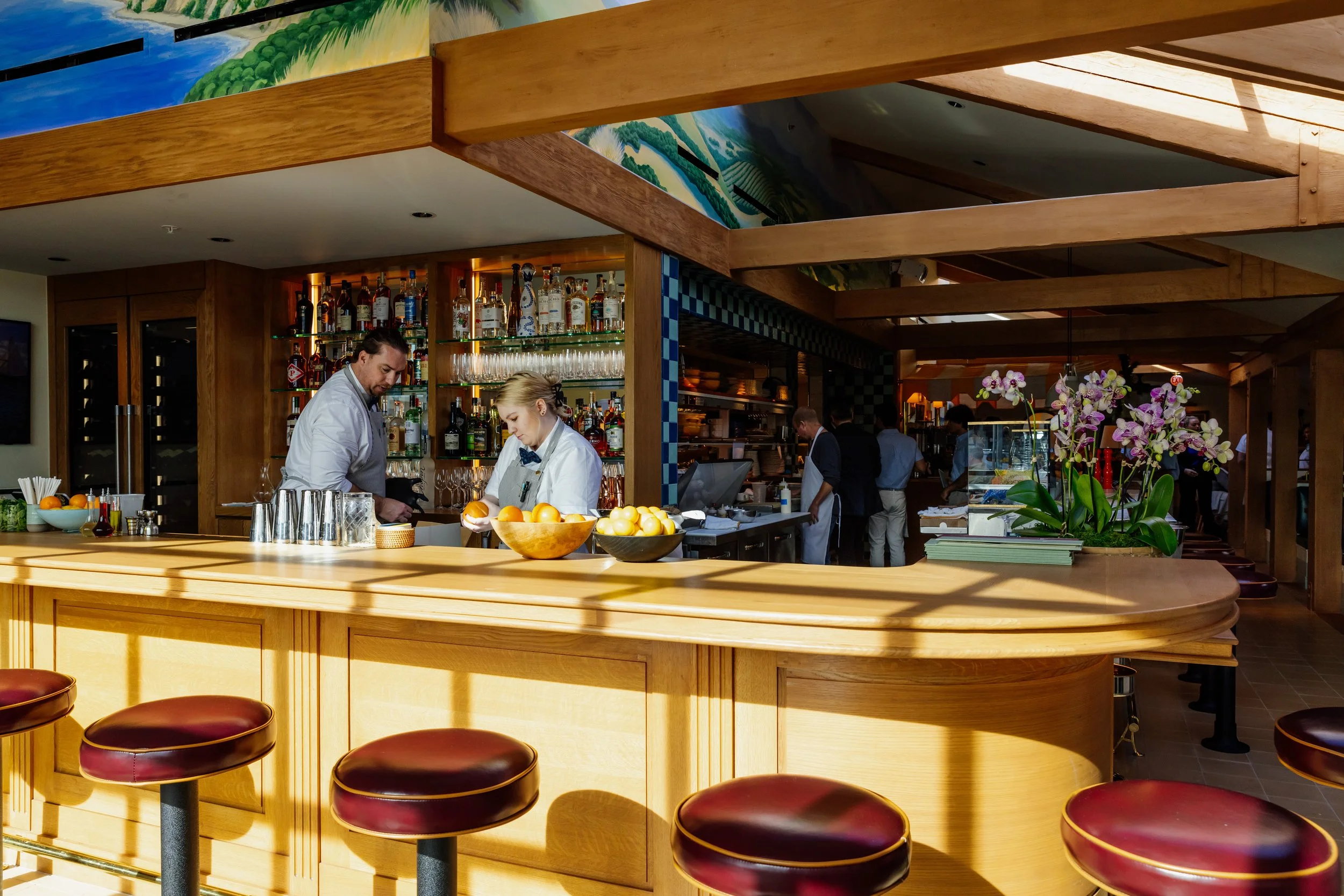 Clark’s Montecito blends the signature charm of Clark’s Oyster Bar with the breezy elegance of the California coast. Set within a historic Spanish Colonial Revival building and working with whimsical Jeff Shelton as the Architect, the design balances classic Clark’s elements—painted wood wainscoting, colorful Mediterranean-inspired tile, and a sturdy wood bar—with bespoke details that embrace Montecito’s laid-back luxury.